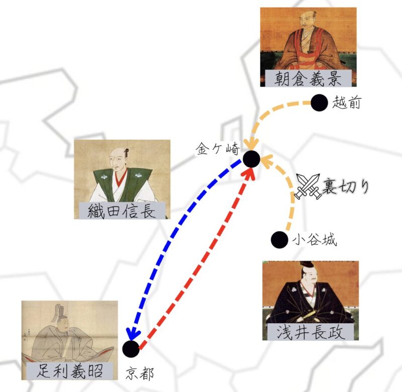 信長が越前の朝倉義景討伐のために北近江を通過し、越前へと進軍。浅井長政は織田を取るか朝倉を取るかの苦渋の決断を迫られます。朝倉家とは代々の友好関係があったため、最終的に長政は織田との同盟を破棄し、織田軍の背後を急襲しました。(金ヶ崎の戦い。)