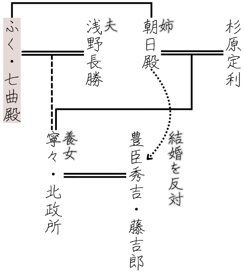 先述のとおり、七曲殿には実子がいなかったため、姉・朝日殿の実娘である寧々を養女としました。木下藤吉郎(豊臣秀吉, 演:池松壮亮)が寧々との結婚の際、朝日殿は藤吉郎が百姓の出身であることを理由に、この縁談に強く反対しています。しかし、浅野長勝が二人の結婚を認めたことで、寧々と藤吉郎は夫婦となりました。