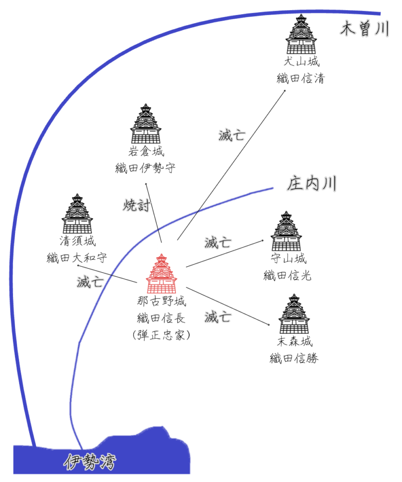 岩倉織田から分かれた一族に清須織田大和守家(織田信清)があり、さらにその家臣の家筋として織田弾正忠家(織田信長)が位置づけられます。