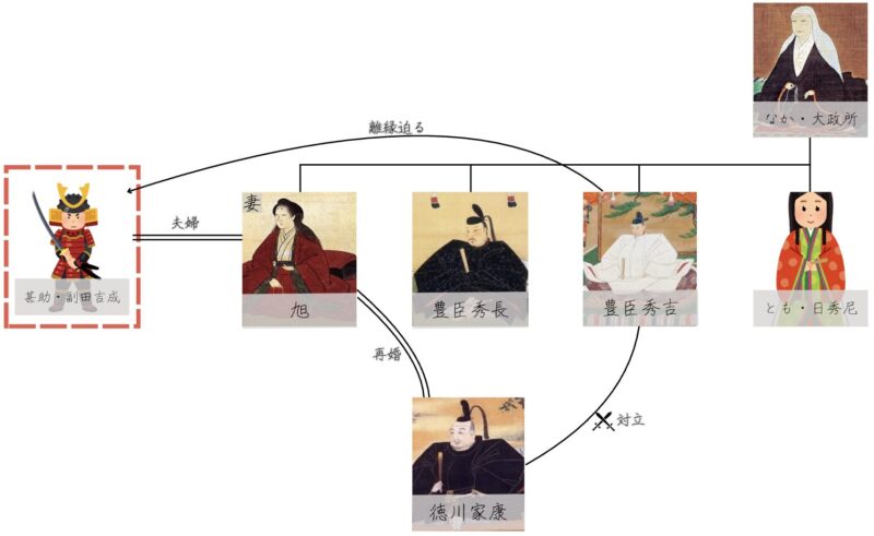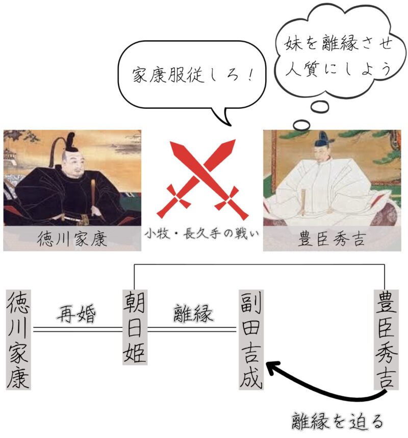 小牧・長久手の戦いによって徳川の力を痛感した豊臣秀吉は、徳川家康との関係改善を図るため、人質として身内を差し出す必要がありました。そこで、実妹である朝日姫を家康に嫁がせるため、副田吉成と離縁させたとされています。離縁を命じられた副田吉成は面目を失い、尾張烏森(故郷)に帰ったともいわれますが、その後の動向については詳しく分かっていません。