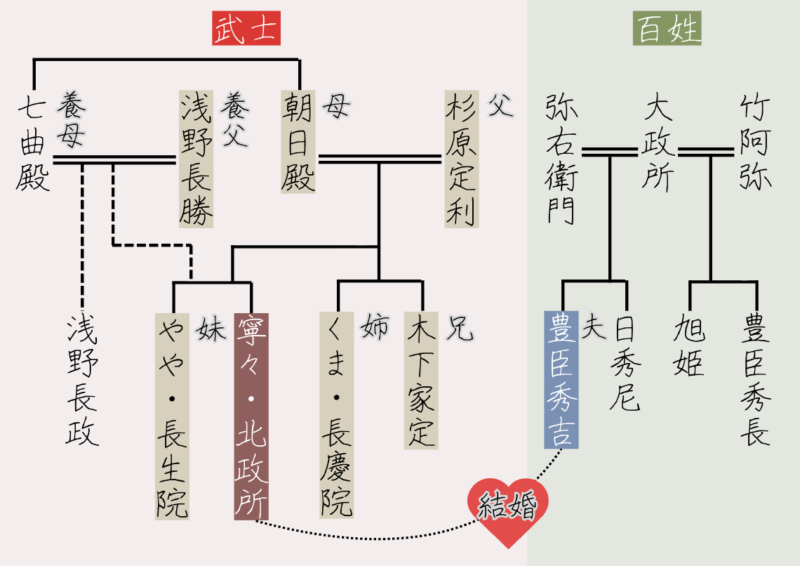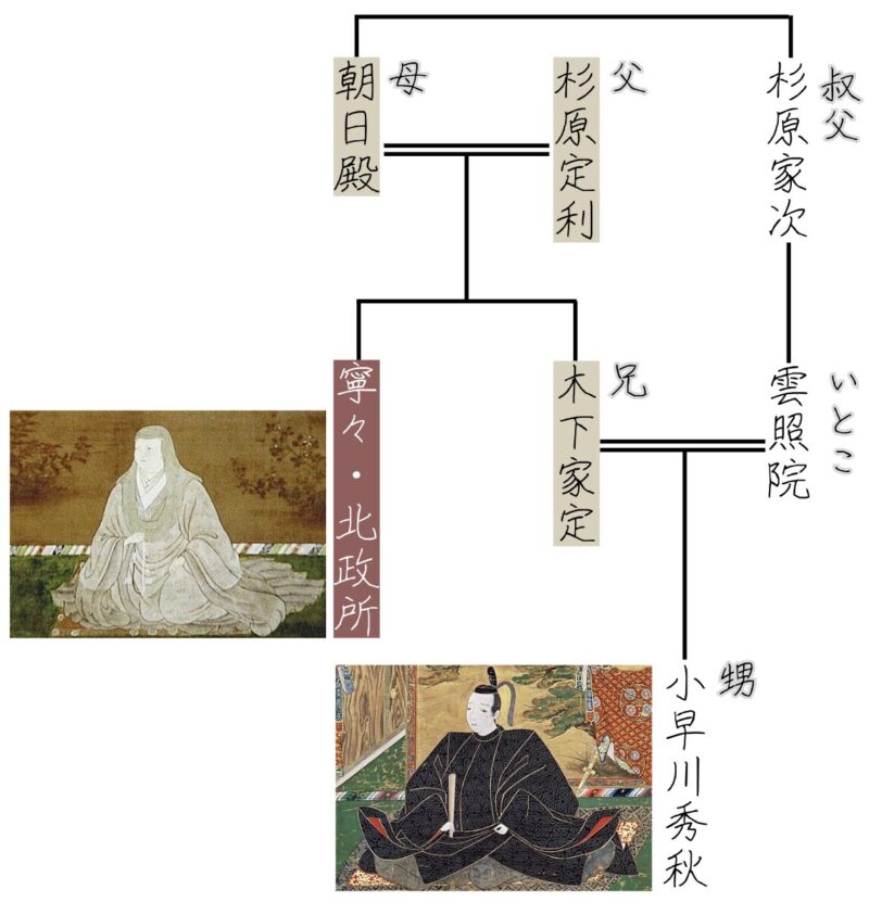 寧々(北政所・高台院)は、織田家臣・杉原定利と朝日殿とのあいだに生まれました。その後、叔母・七曲殿に子がいなかったことから、浅野家に養女として迎えられました。
