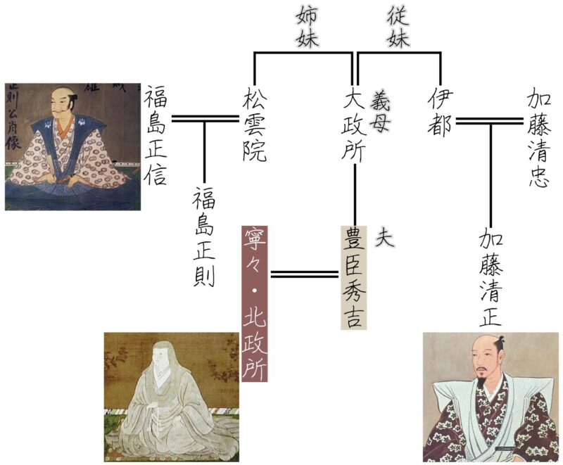 豊臣秀吉の母・大政所と加藤清正の母・伊都が従妹同士。福島正則の母が大政所と姉妹関係です。