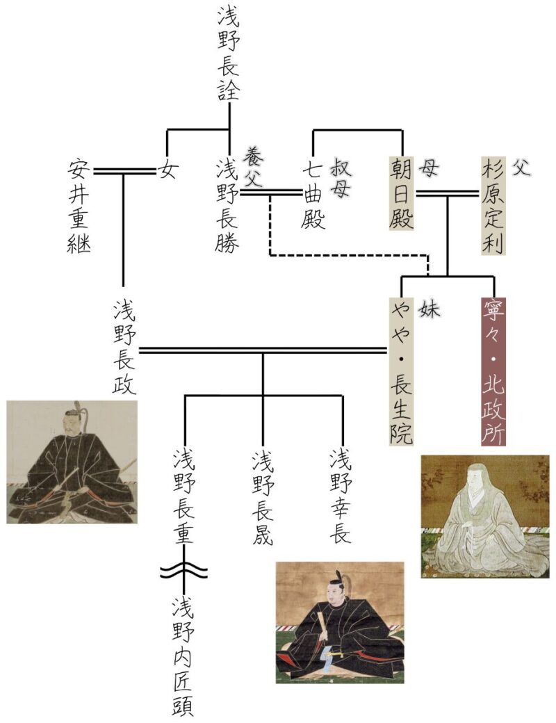 寧々と浅野長政は親戚関係にあり、赤穂浪士の討ち入りで知られる浅野内匠頭も縁戚です。