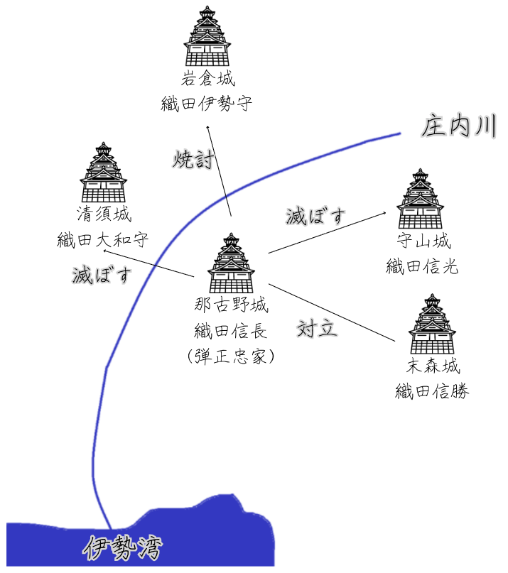 信長は那古野城、信勝は末森城での二元体制でありましたが、敵対する一族の織田信光とともに対抗するなどの動きを見せています。しかし、斎藤道三(演:麿赤兒)が亡くなり、斎藤義龍(演:DAIGO)が織田伊勢守を支援し始めると、信勝も信長に対立する動きをみせました。
