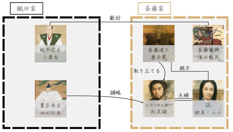 大沢次郎左衛門(演:松尾諭)は、斎藤道三(演:麿赤兒)の家臣であり、妻は道三の娘であったといわれています。本名は「大沢正秀」といわれていますが、基康・正重・正継・正次・為康・正盛など、複数の名が史料に残っています。