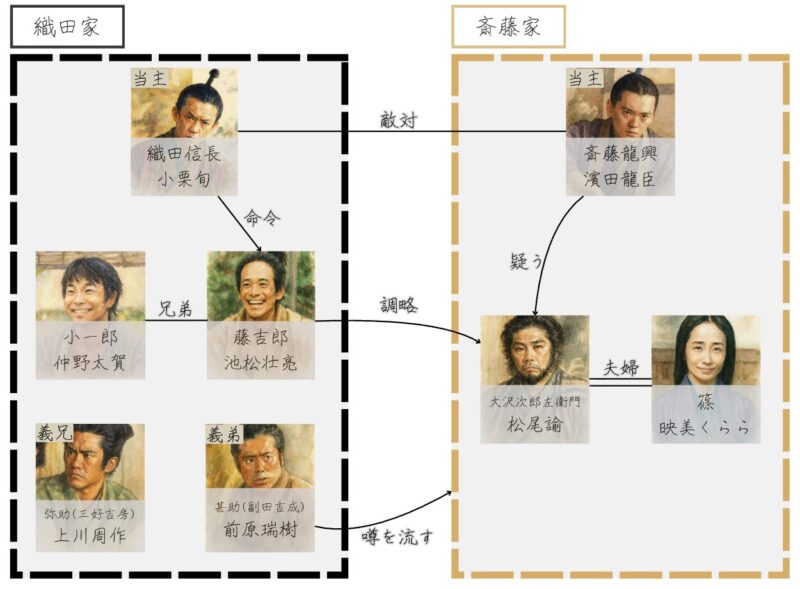織田信長は美濃攻略の一環として、藤吉郎と小一郎(豊臣秀長, 演:仲野太賀)に対し、鵜沼城主の大沢次郎左衛門の調略を命じ、成功すれば「侍大将」に取り立てると約束しました。