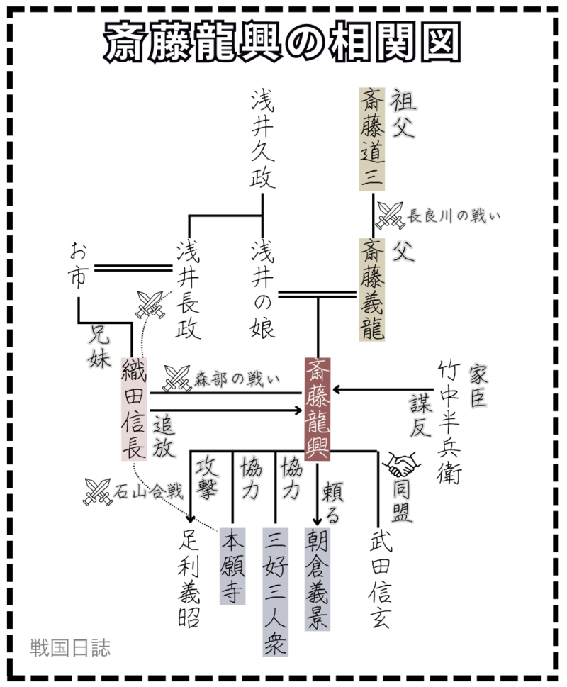 1561年、織田信長は龍興のいる美濃へ侵攻を開始し、森部の戦いが勃発しました。家督を継承したばかりの若年の龍興は多くの重臣を失いながらも、織田家を追い払っています。
