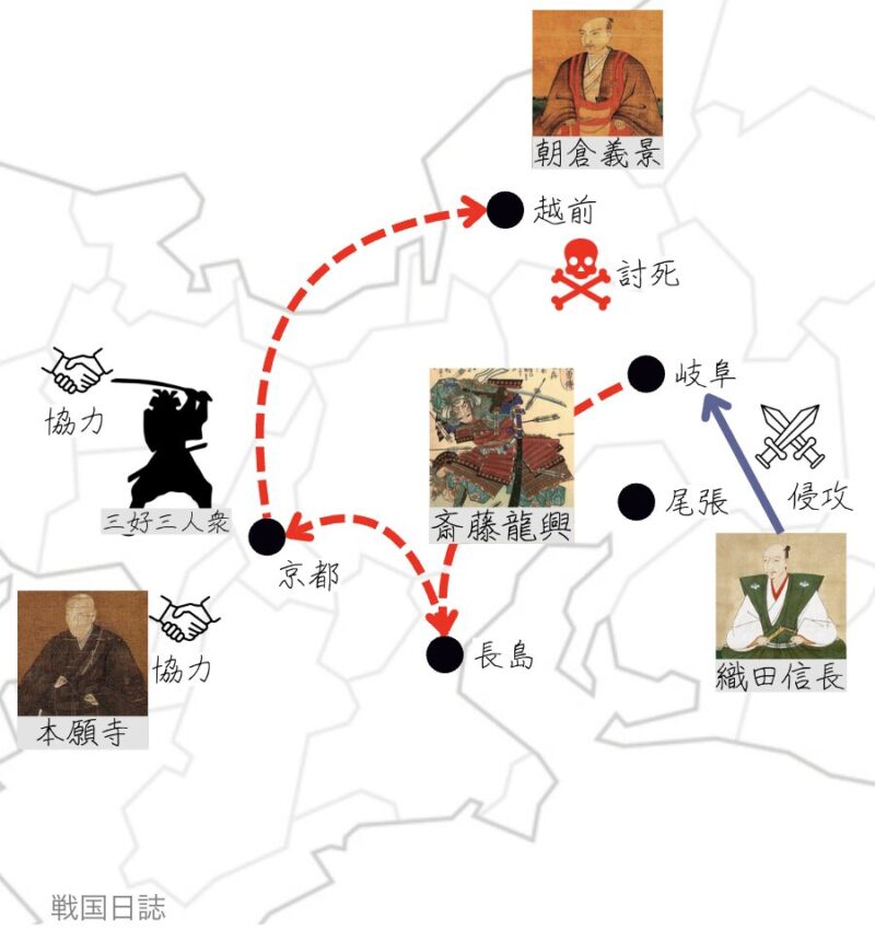 三好三人衆が勢力を失うと、龍興は畿内に居場所をなくし、縁戚関係にあった越前(福井県)の朝倉義景を頼りました。斎藤家と朝倉家の具体的な関係は不明ですが、龍興は「客将」として迎えられ、待遇は悪くなかったと伝えられています。
