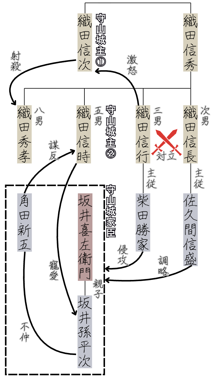坂井孫平次は、父・喜左衛門と同様に守山城主であった織田信次織田信時に仕えました。新たに守山城主となった織田信時は孫平次を寵愛する一方、喜左衛門と同世代の家臣・角田新五を遠ざけるようになります。これに不満を募らせた角田新五は謀反を起こし、その結果、織田信時は自害に追い込まれました。