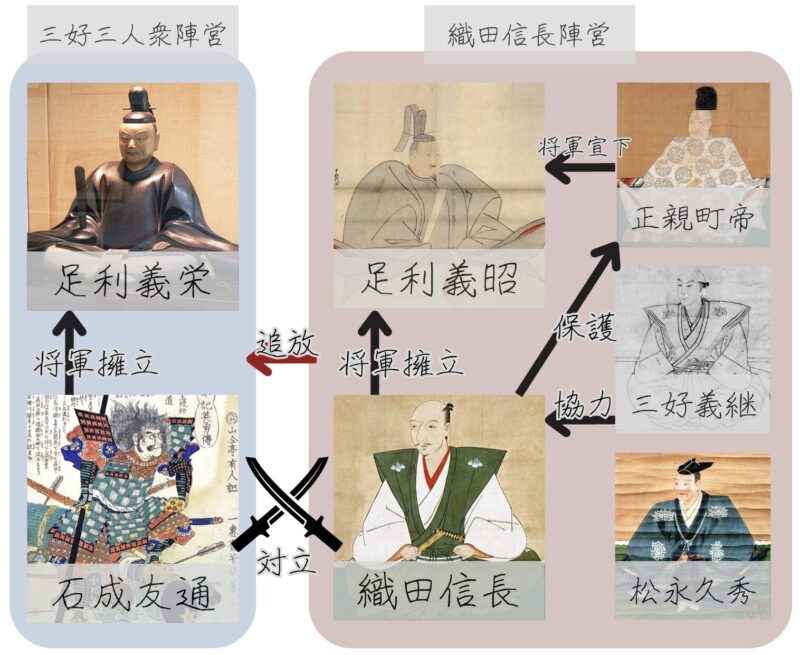 将軍・足利義輝を暗殺し、代わって足利義栄を将軍に擁立することで、畿内の実権を握っていた。当時、京都周辺の政治を動かしていたのは、まさに三好三人衆だったのである。