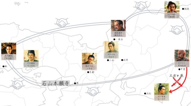 元亀三年(1572年)十月、信玄は総勢二万五千の軍勢を率いて遠江(静岡県西部)へ侵攻を開始し、十二月、三方ヶ原の戦いで徳川家康(演:松下洸平)と激突した。この戦で徳川軍は大敗し、その勢いに乗って足利義昭は二条御所で挙兵した。信長は一気に劣勢に陥ったのであった。