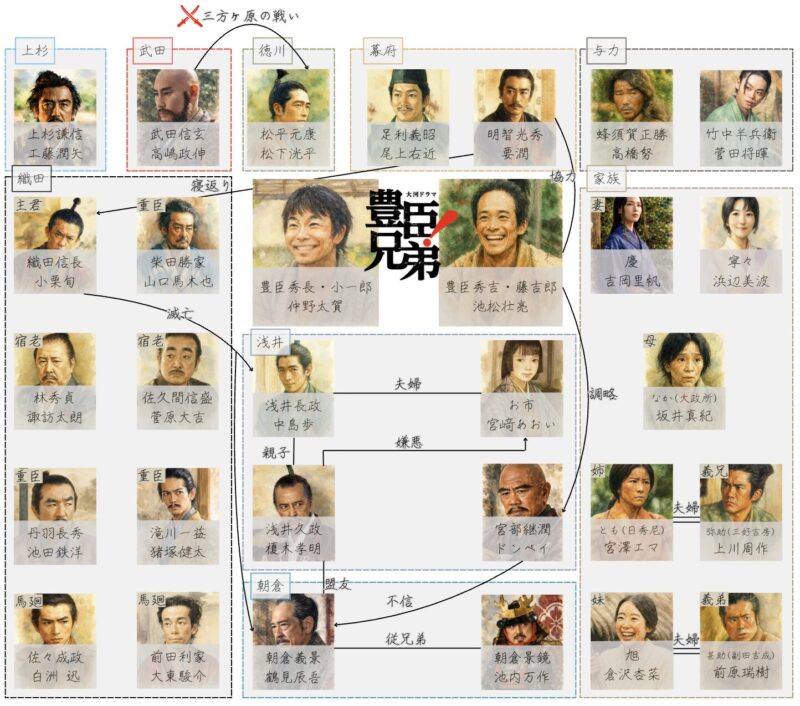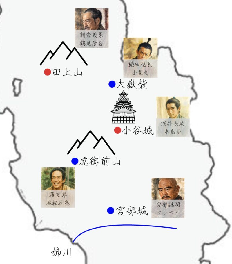 残るは浅井長政(演:中島歩)がいる本丸のみとなり、小一郎(豊臣秀長, 演:仲野太賀)と藤吉郎(豊臣秀吉, 演:池松壮亮)は信長の前に進み出た。信長は藤吉郎らに和睦交渉と市の助命嘆願をすることを許し、兄弟は小谷城の主殿に足を踏み入れた。